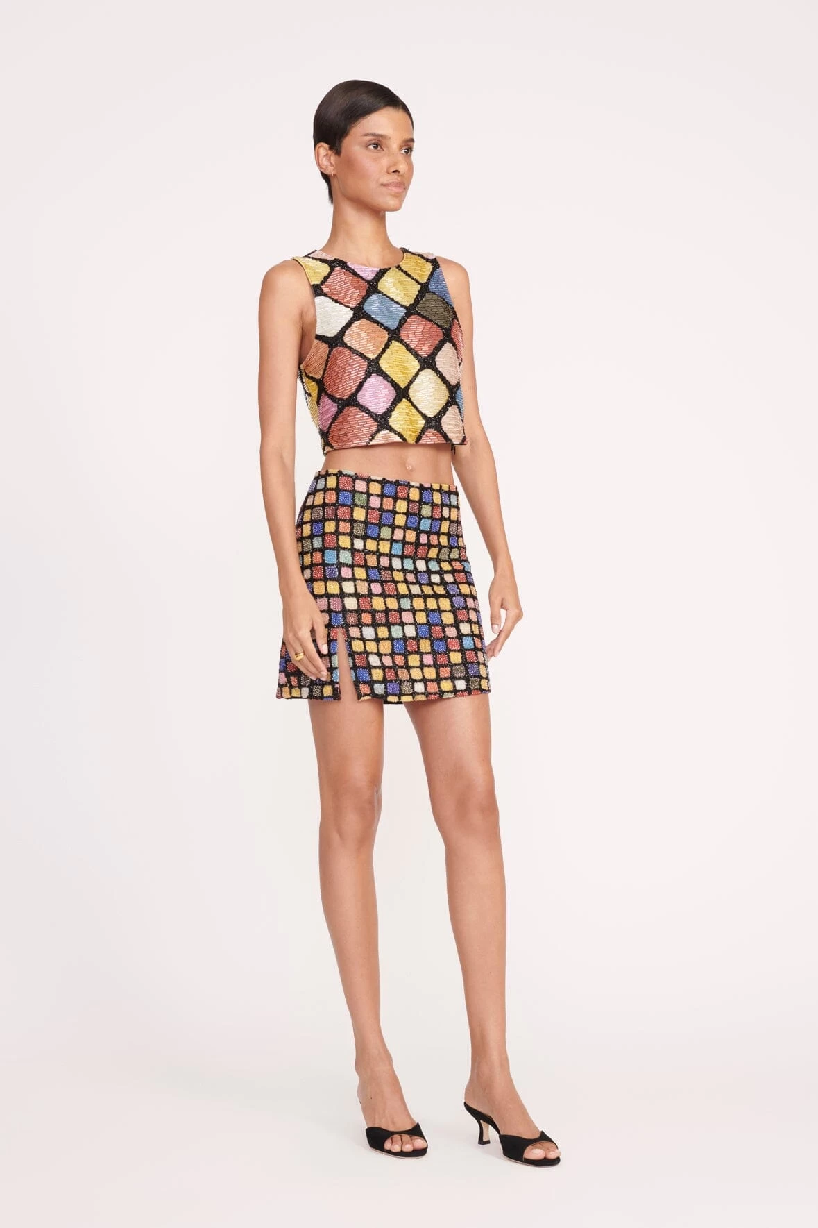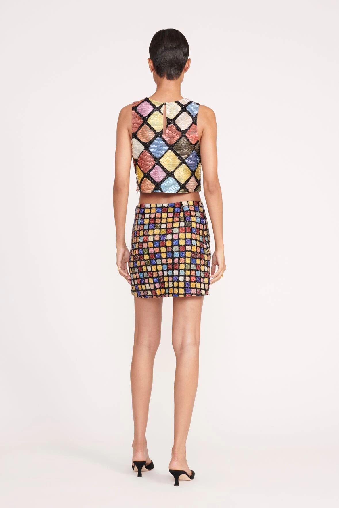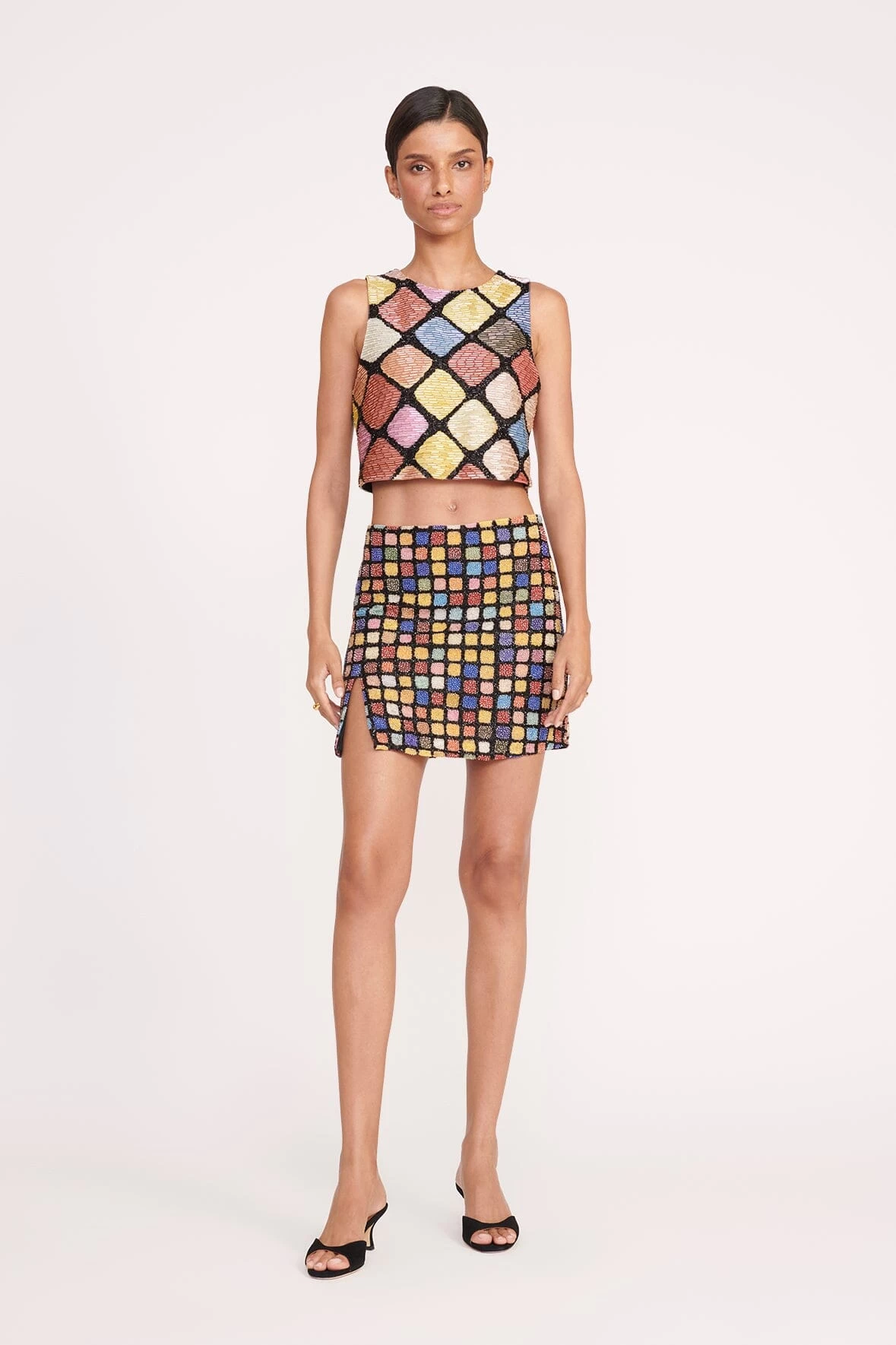 A hand-beaded crop top featuring a festive geometric multicolor pattern. Wear the Alora Top as a statement piece with black trousers or as a matching beaded set with the Emerie Skirt.