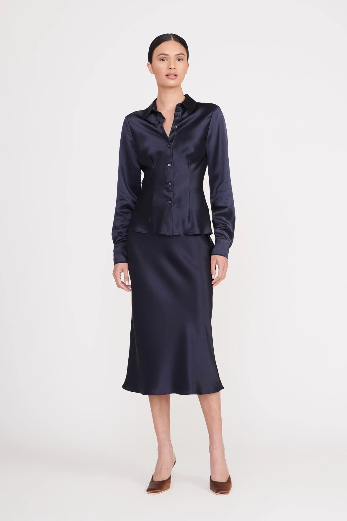 Dress the Bogart Top up or down. A classic button-down silhouette offers an easy, versatile piece in this updated satin fabric.