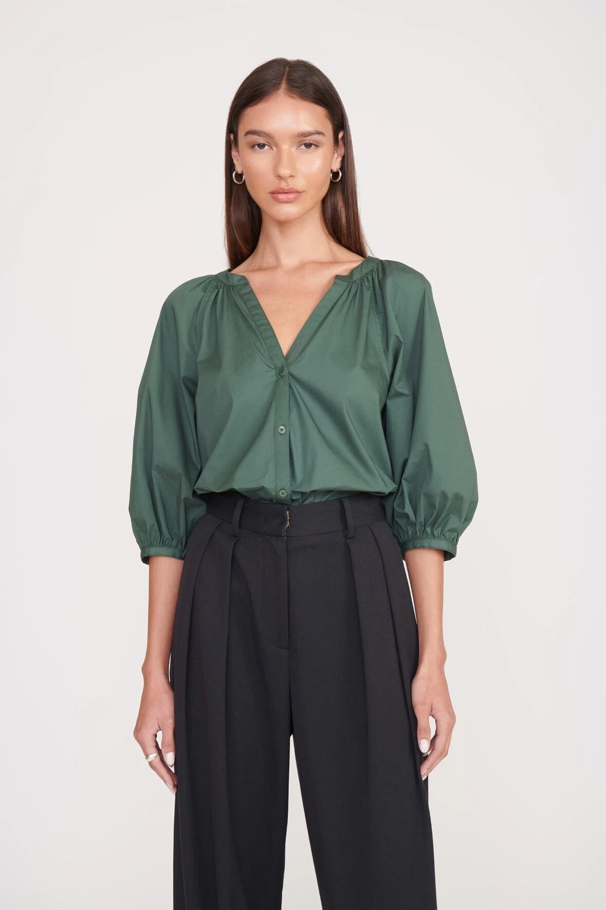 The Dill Top is a cotton poplin button-down with 3/4 puffed sleeves. This classic top can be worn year-round.