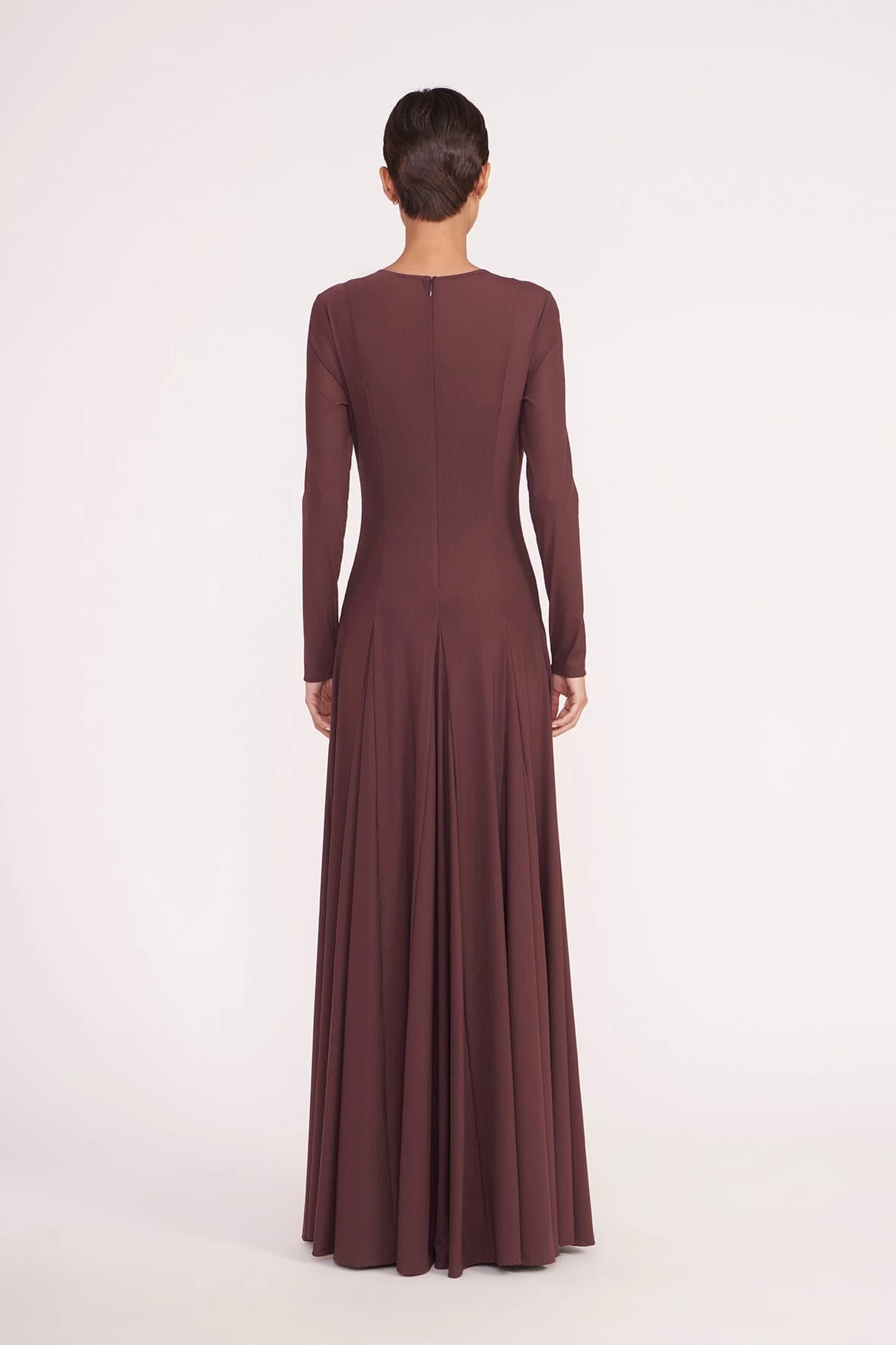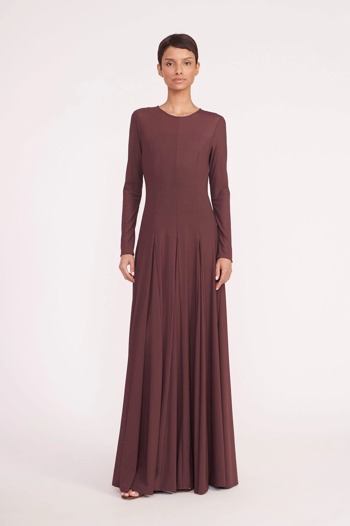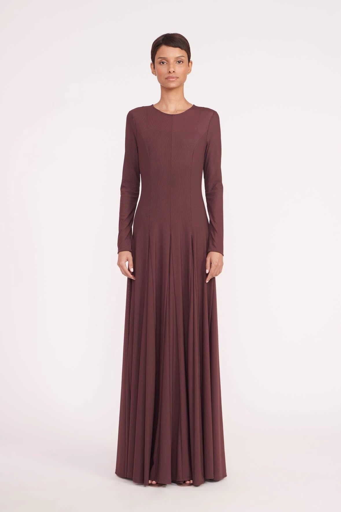 A long sleeve mesh maxi, the Donovan Dress features a flattering corset seaming at the bodice. This style includes a mesh slip and a crew neckline.