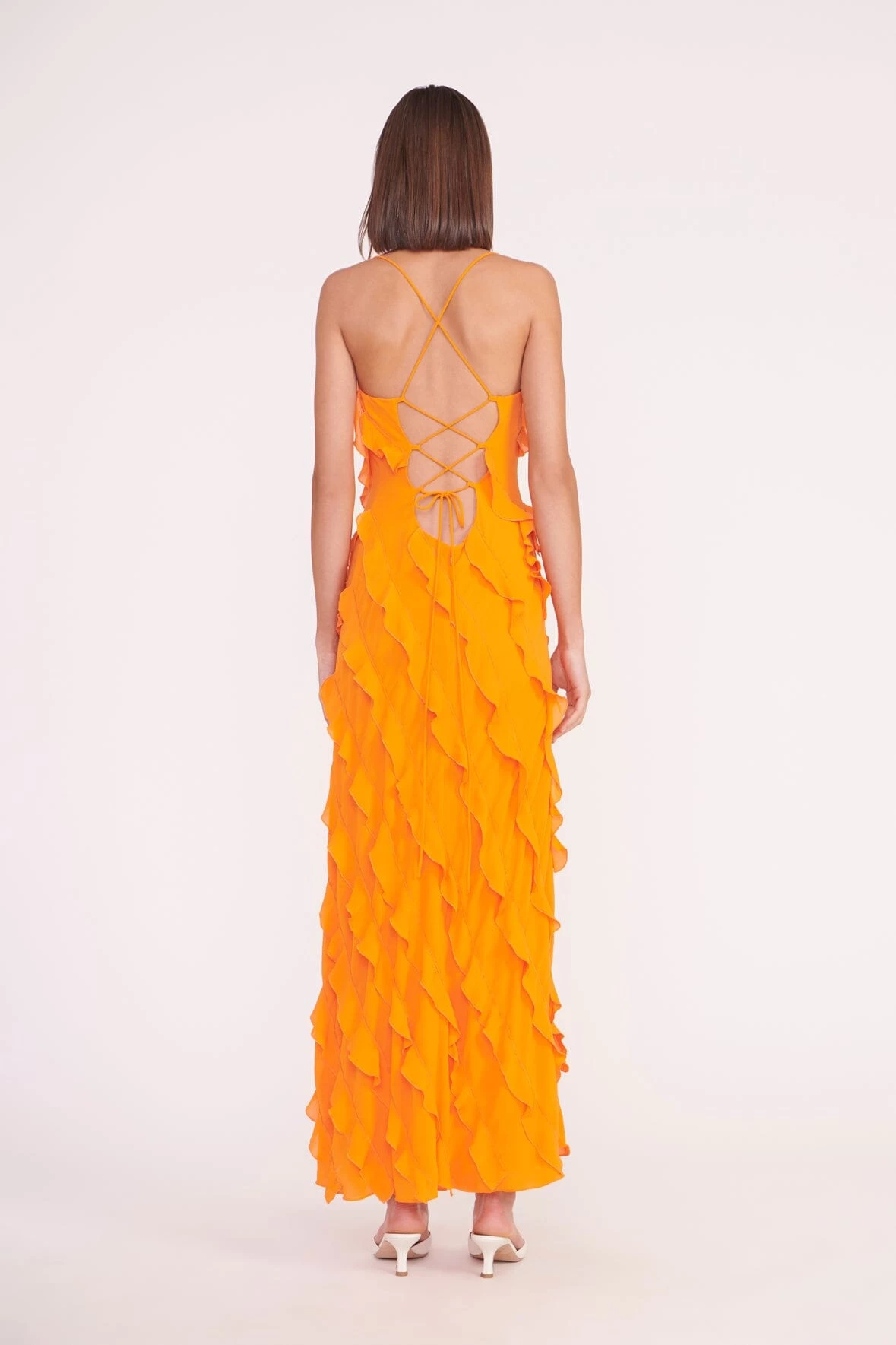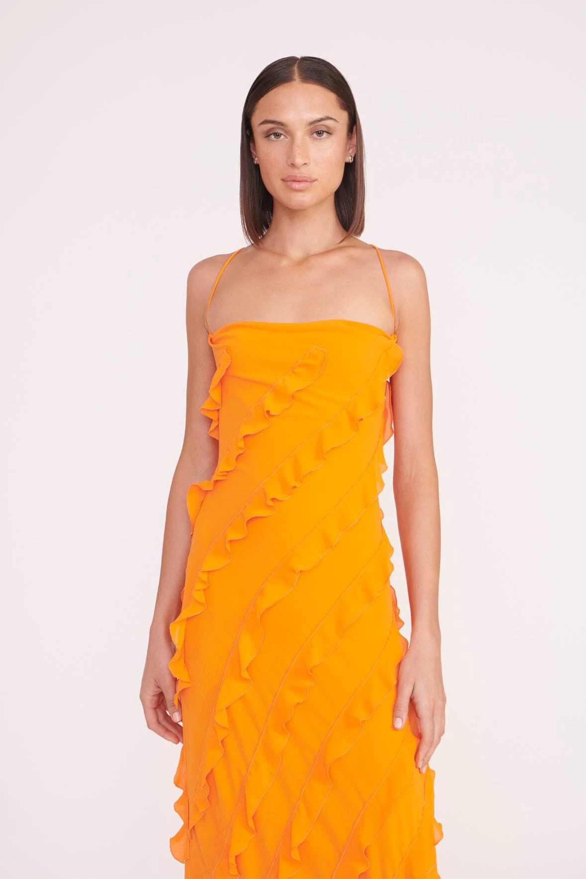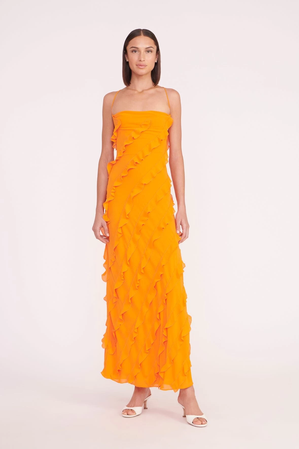 A maxi slip dress with fitted top, the Elvire features horizontal ruffles and a strappy neckline.