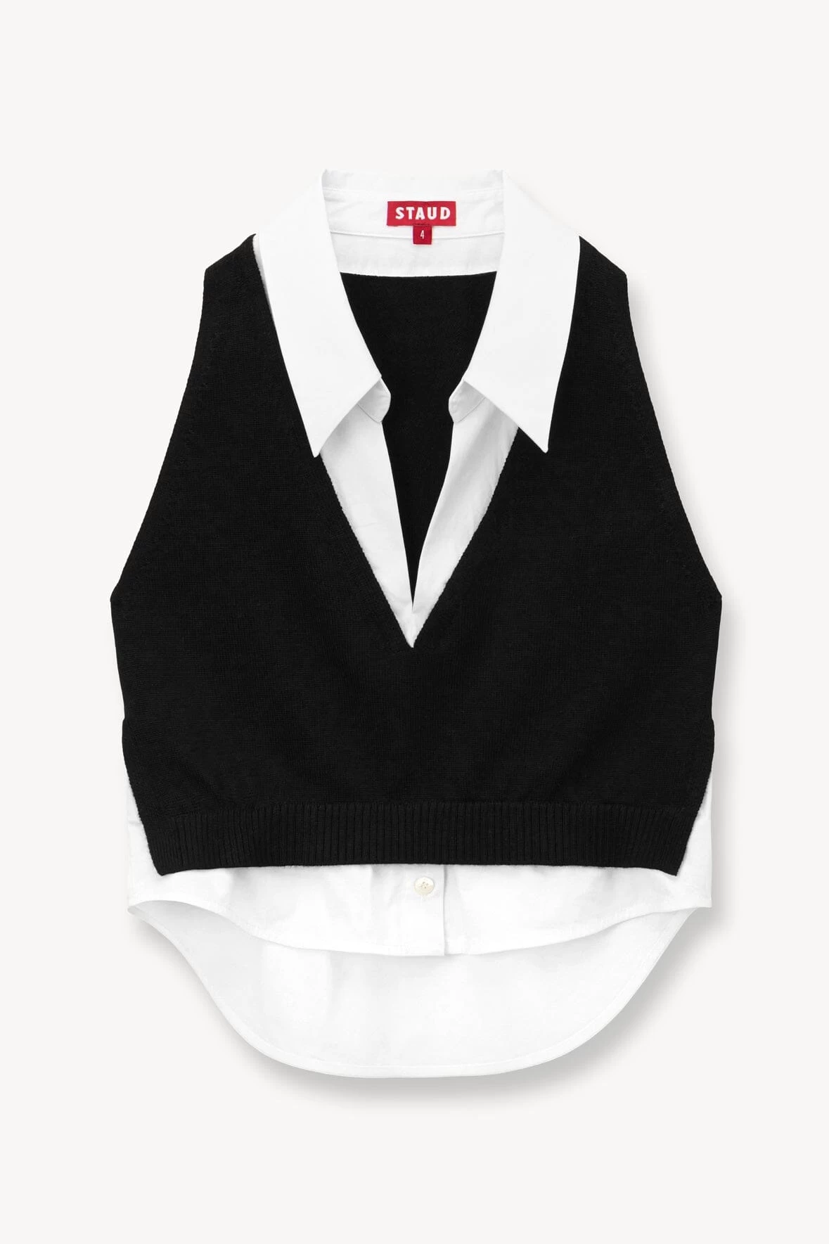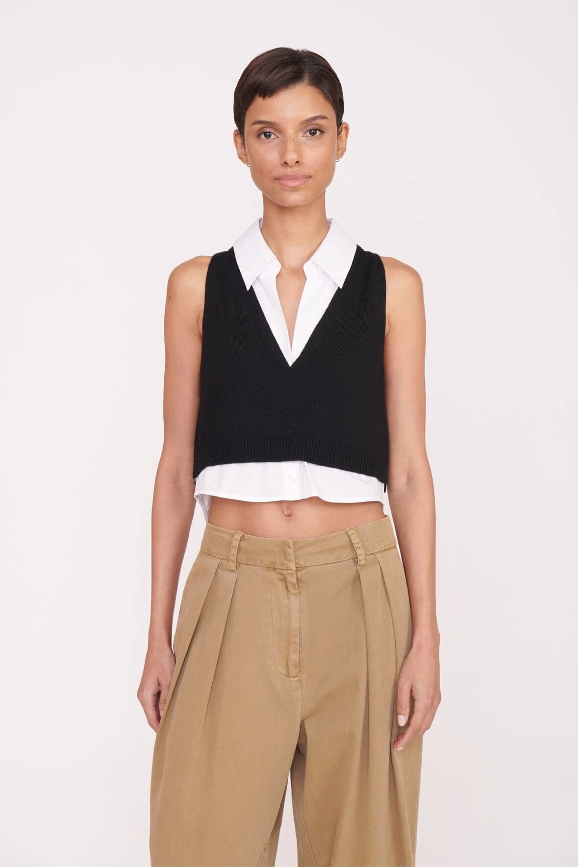 A cropped mixed media sweater vest with v-neckline and contrast cotton poplin collar.