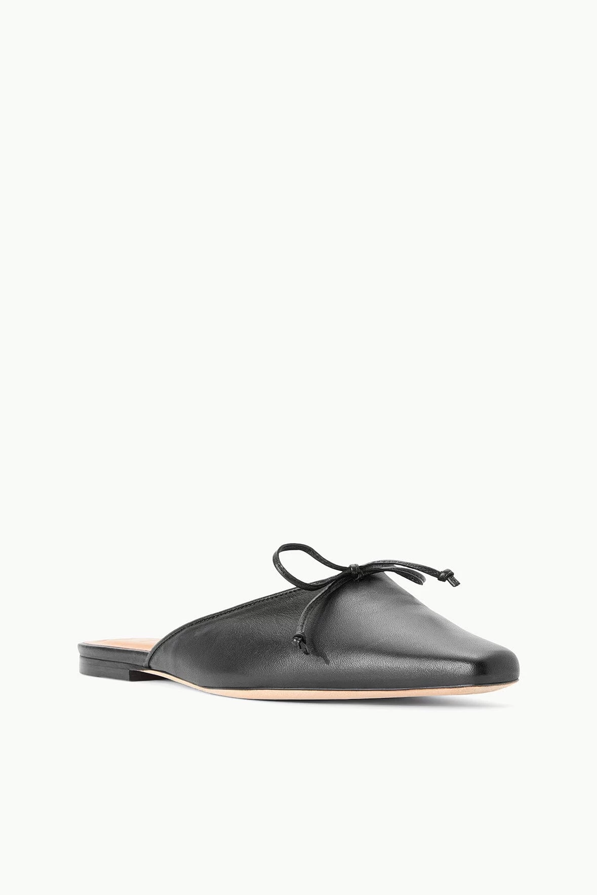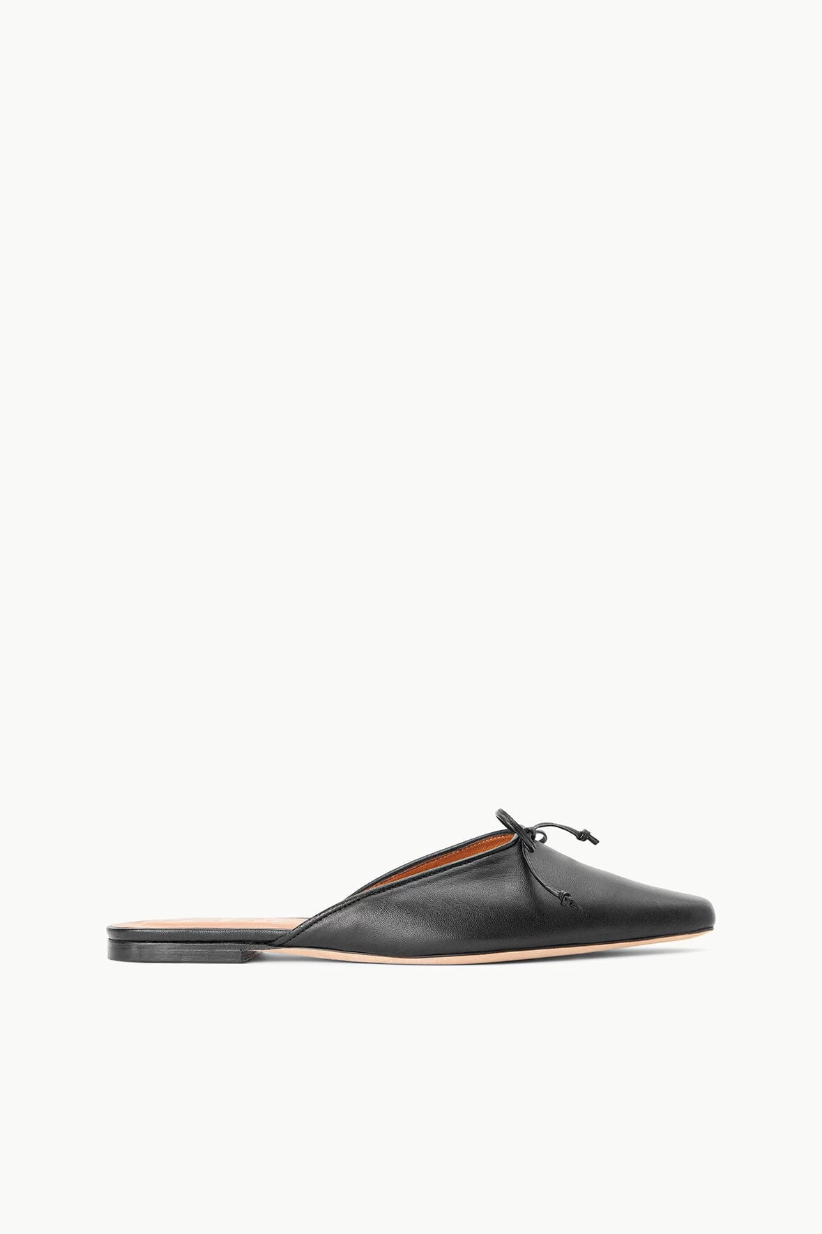 A flat leather mule, the Gina features a sleek pointed toe and bow detail.