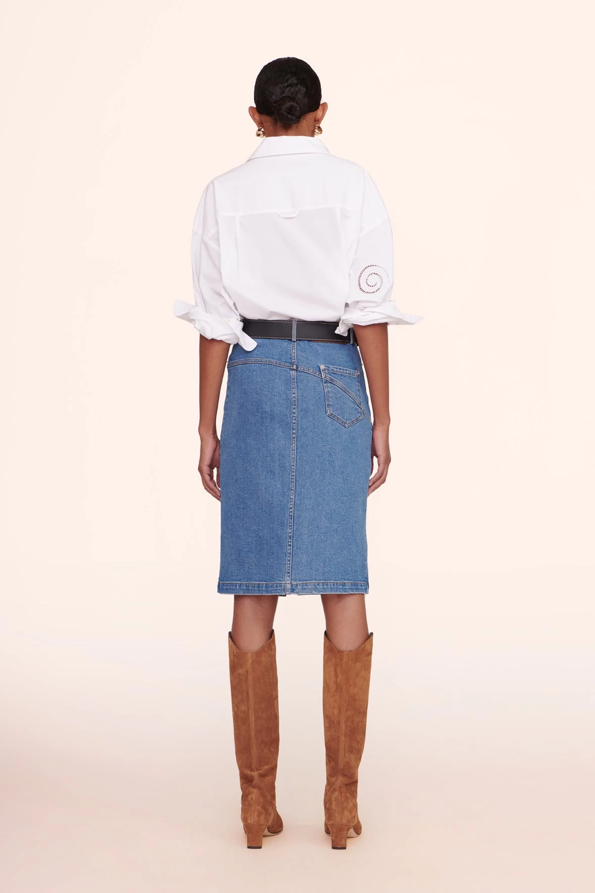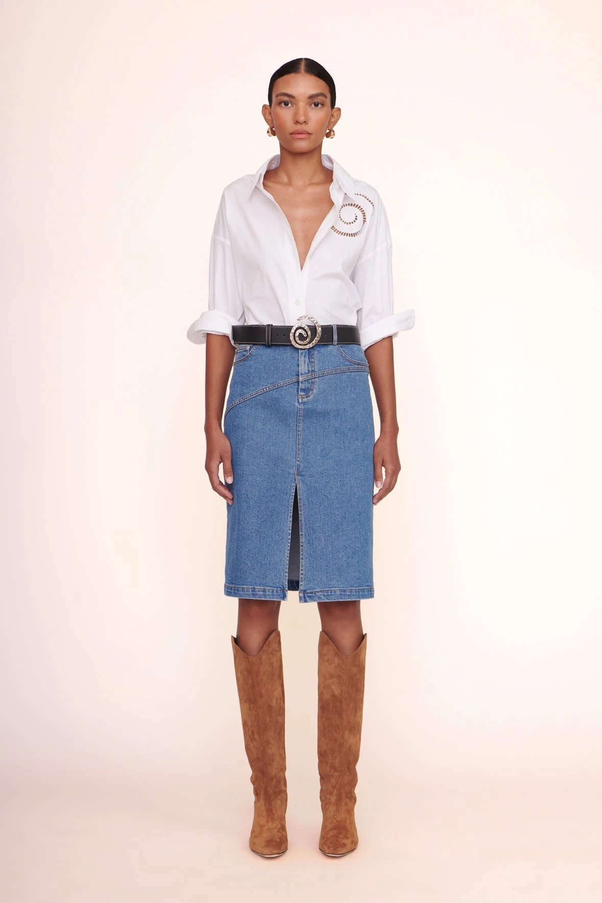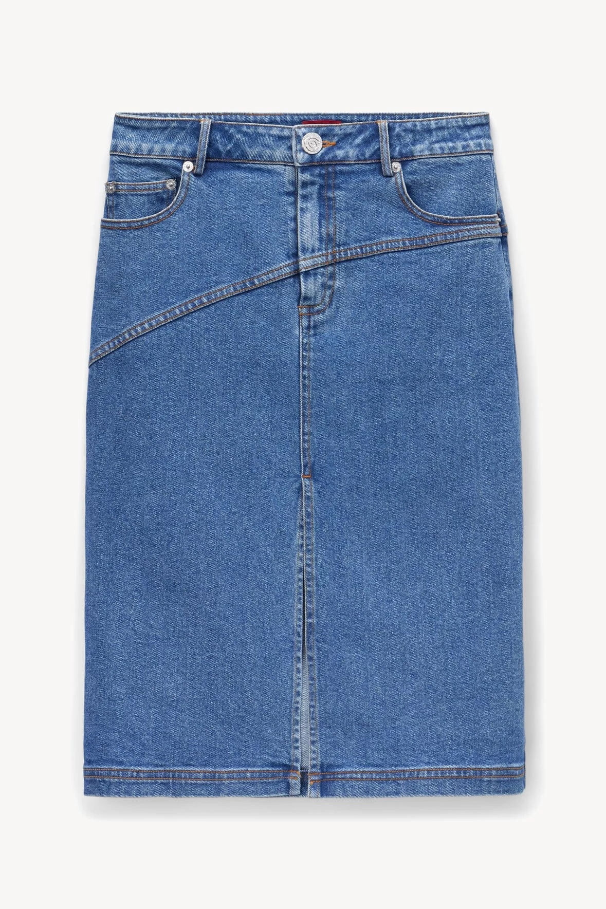 The pencil skirt. A 5-pocket denim midi, the Hudson Skirt features a center front slit and curved seaming detail.