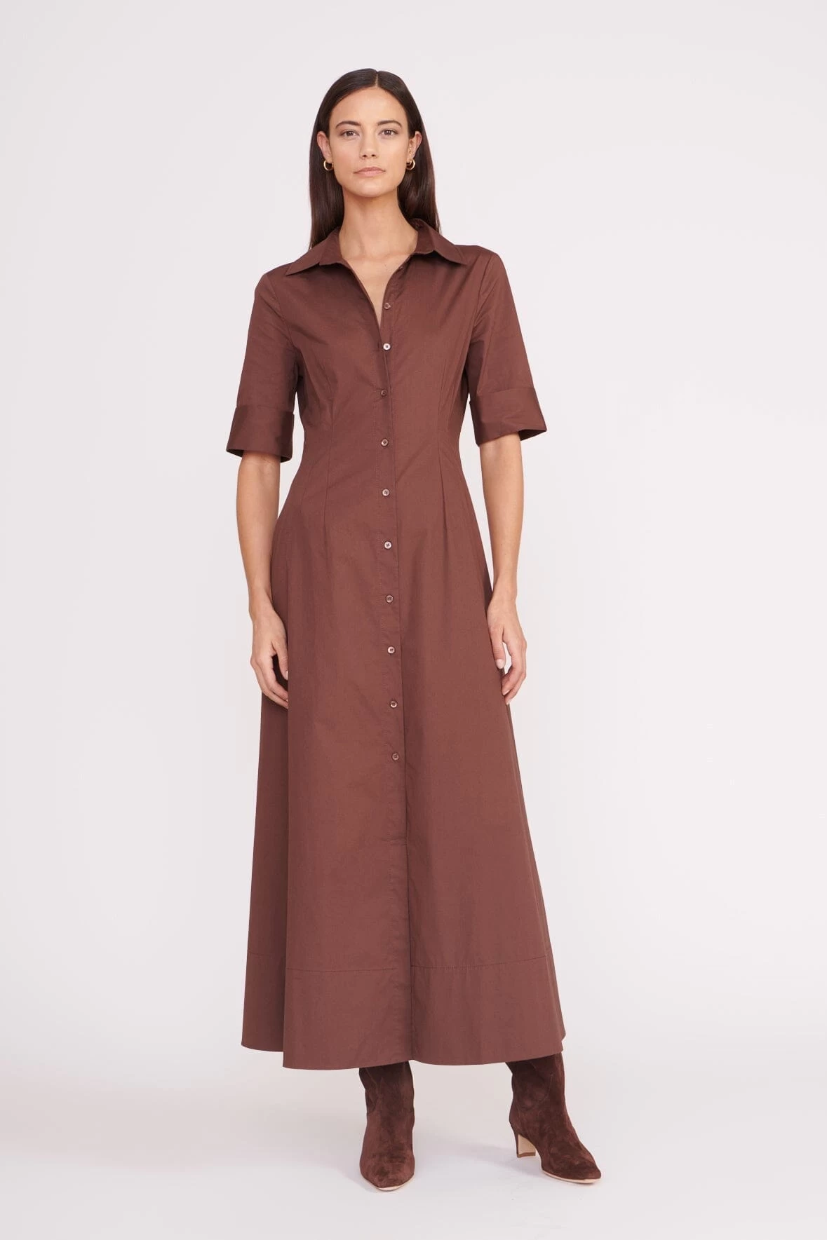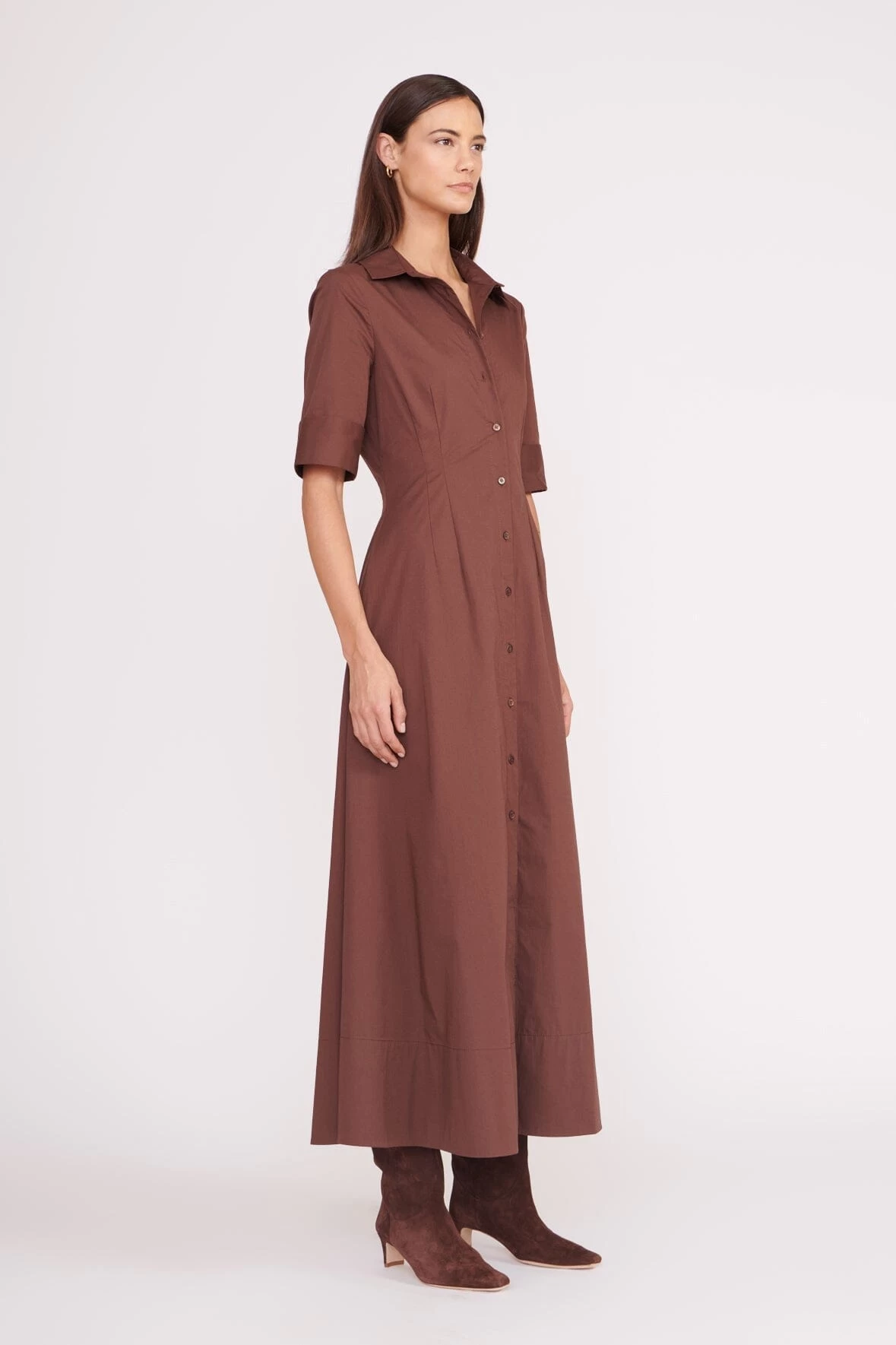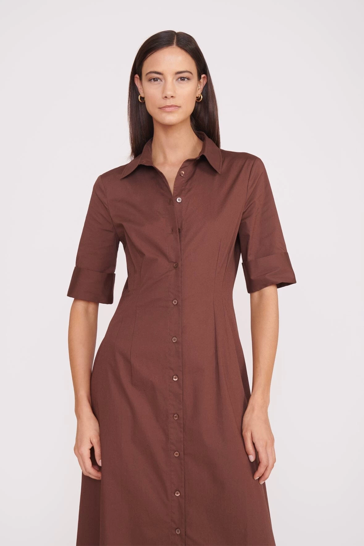 A maxi shirt dress made out of stretchy cotton poplin, the Joan Dress is a modern yet polished take on a classic.