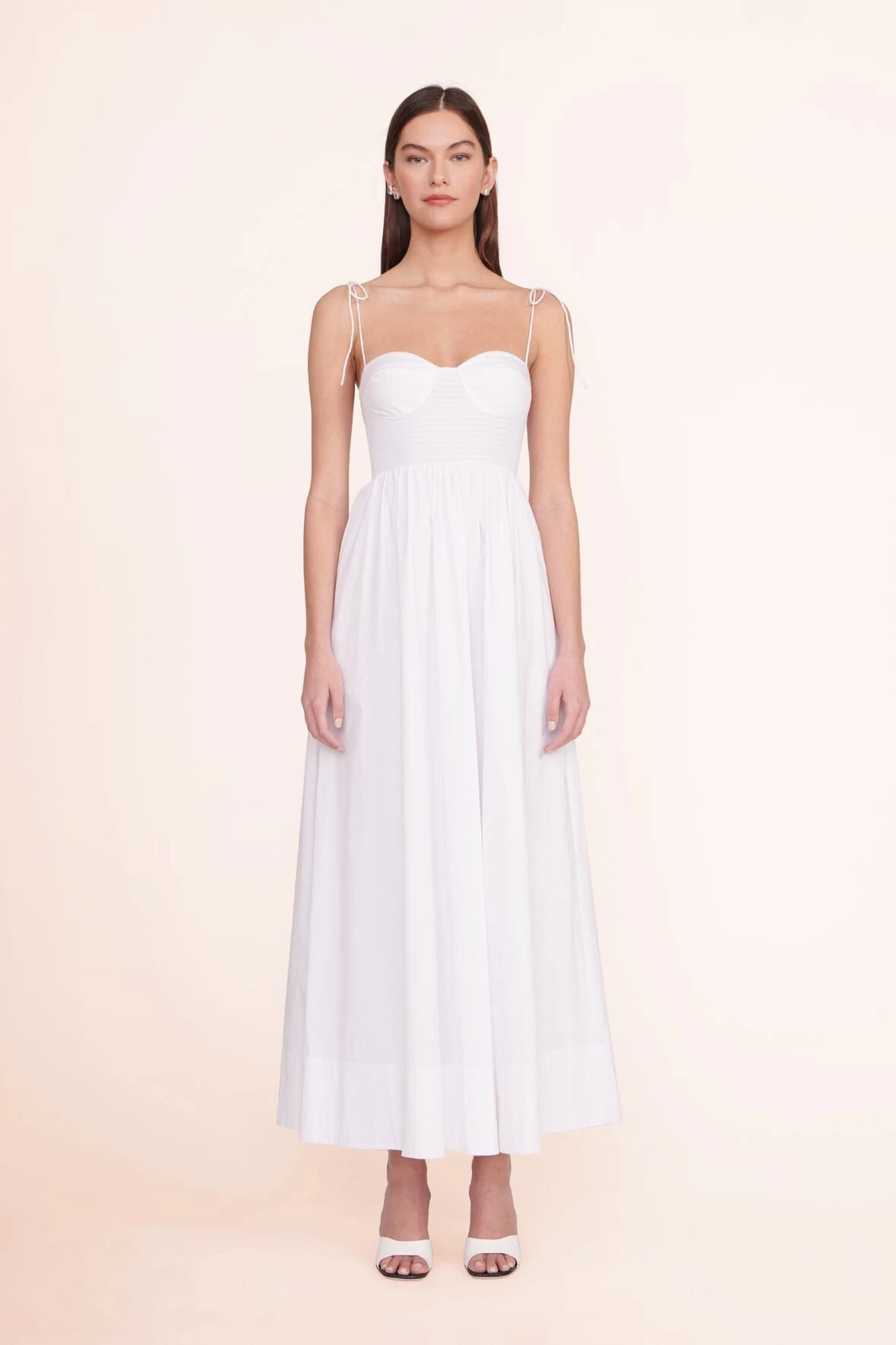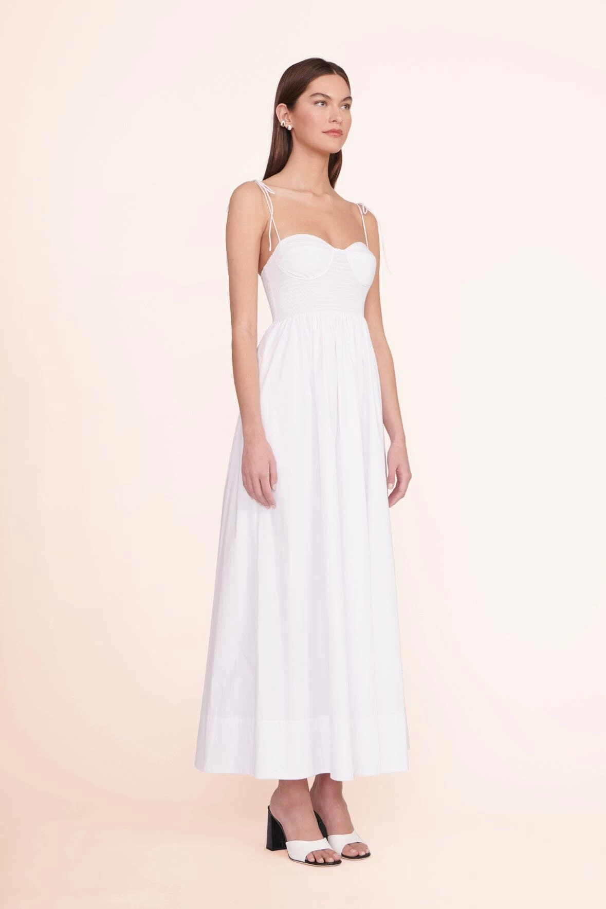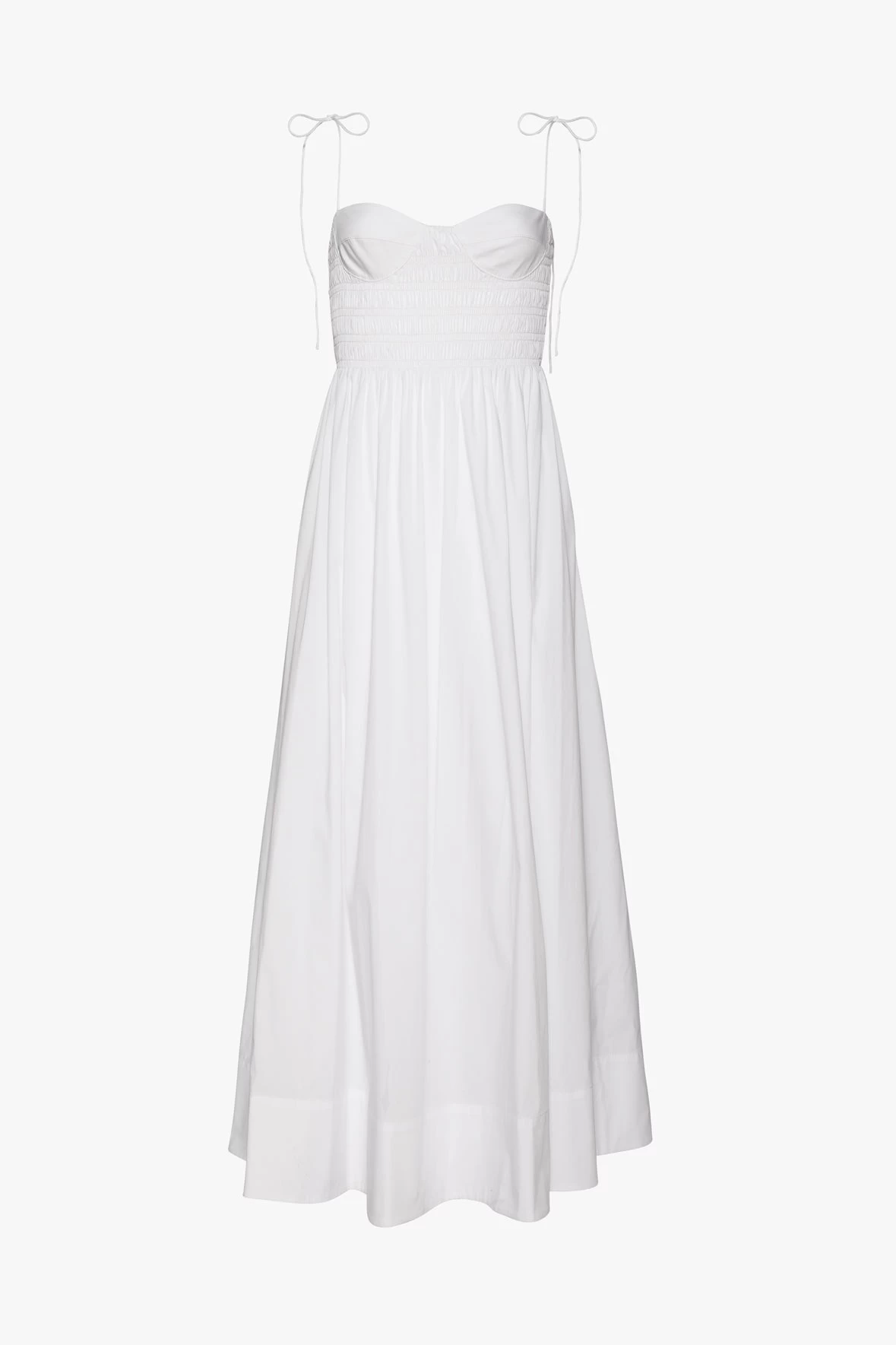 A cotton poplin maxi dress, the Landry Dress features a smocked corset bodice with adjustable tie straps. This style has a full skirt with shirring details and side seam pockets.