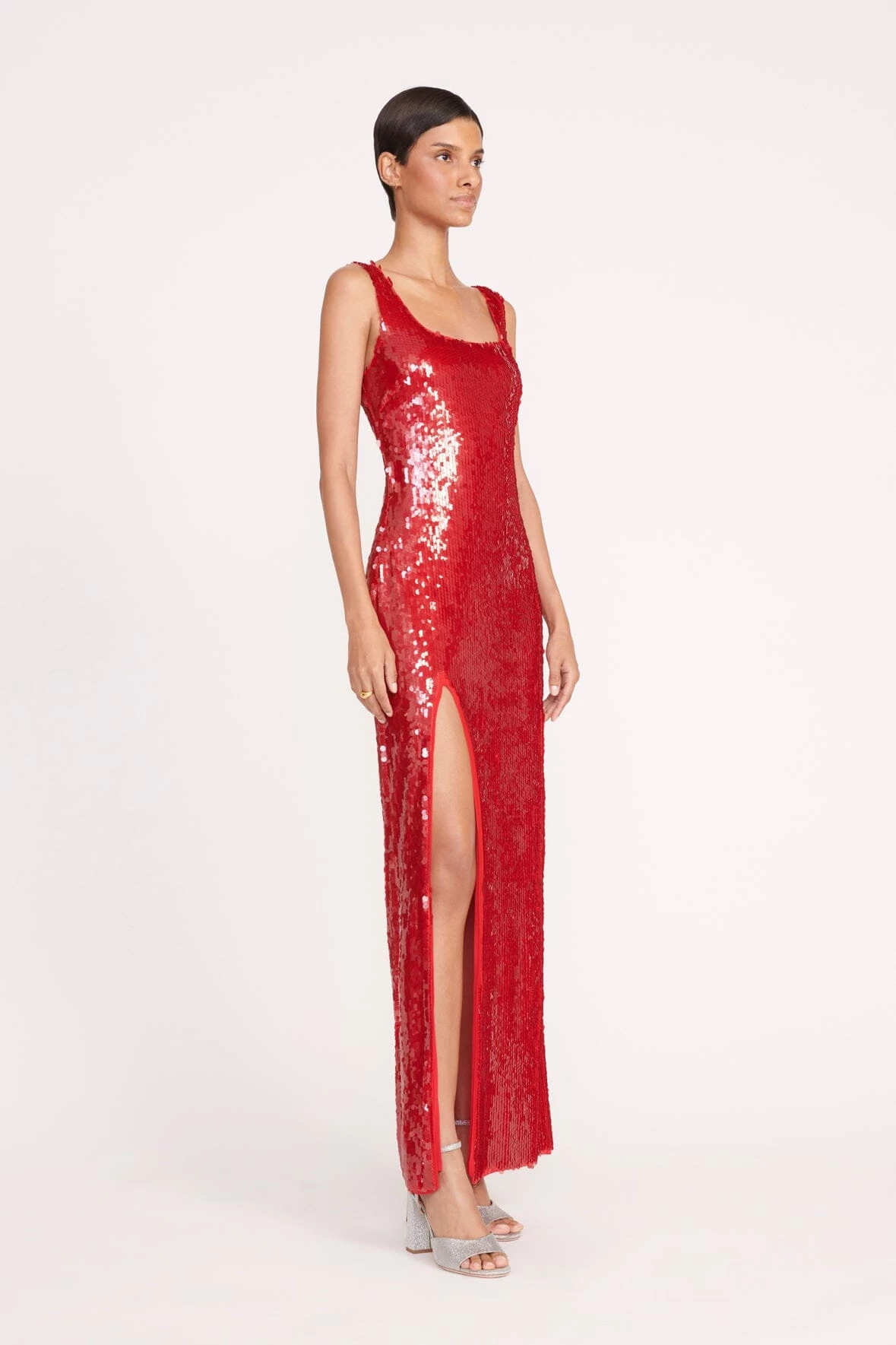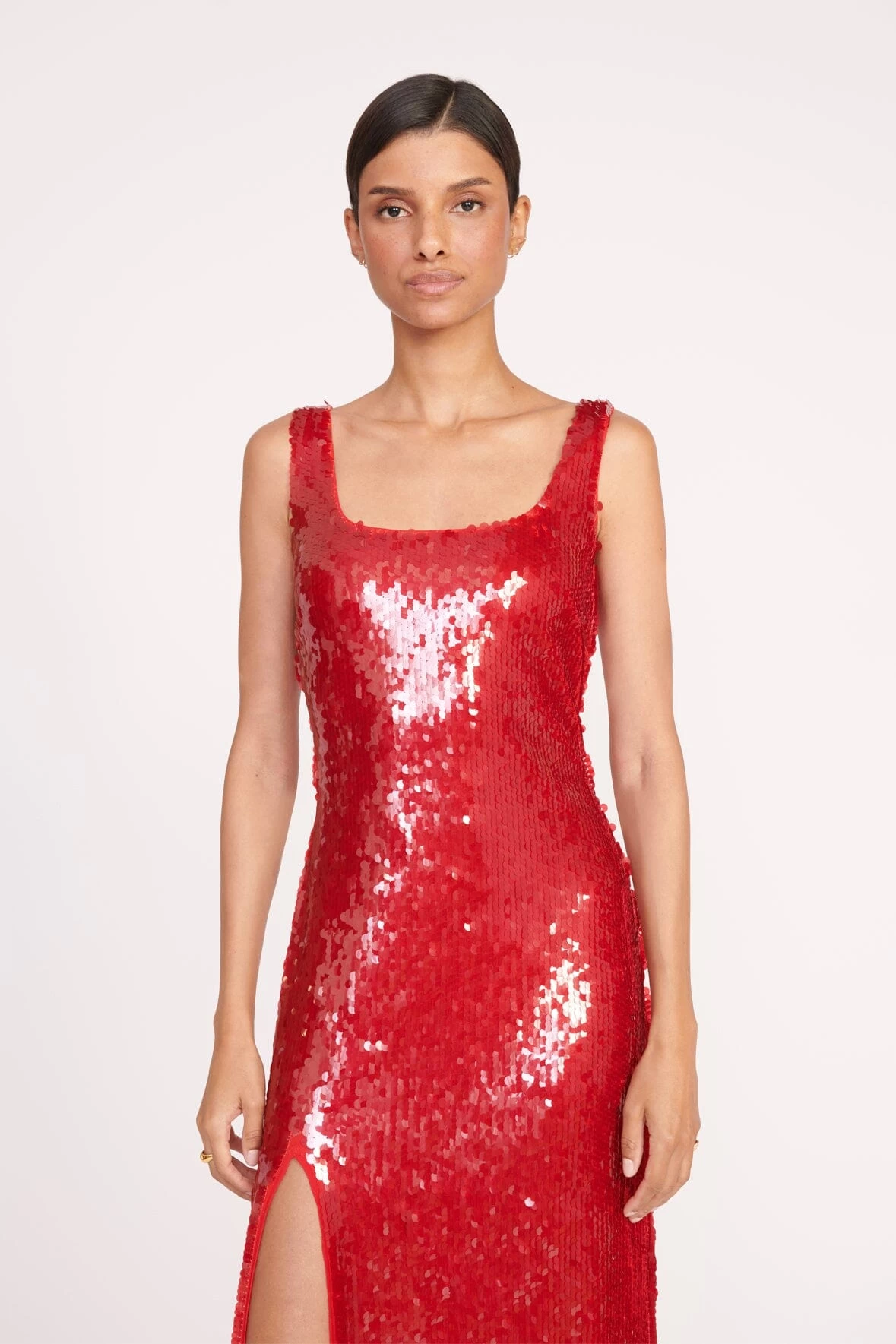 The full-length update to our favorite Le Sable Dress, The Maxi Le Sable Dress is a maxi cocktail dress embellished with shiny paillettes. This style features bra-friendly straps, a hidden back zipper, and a thigh high slit.