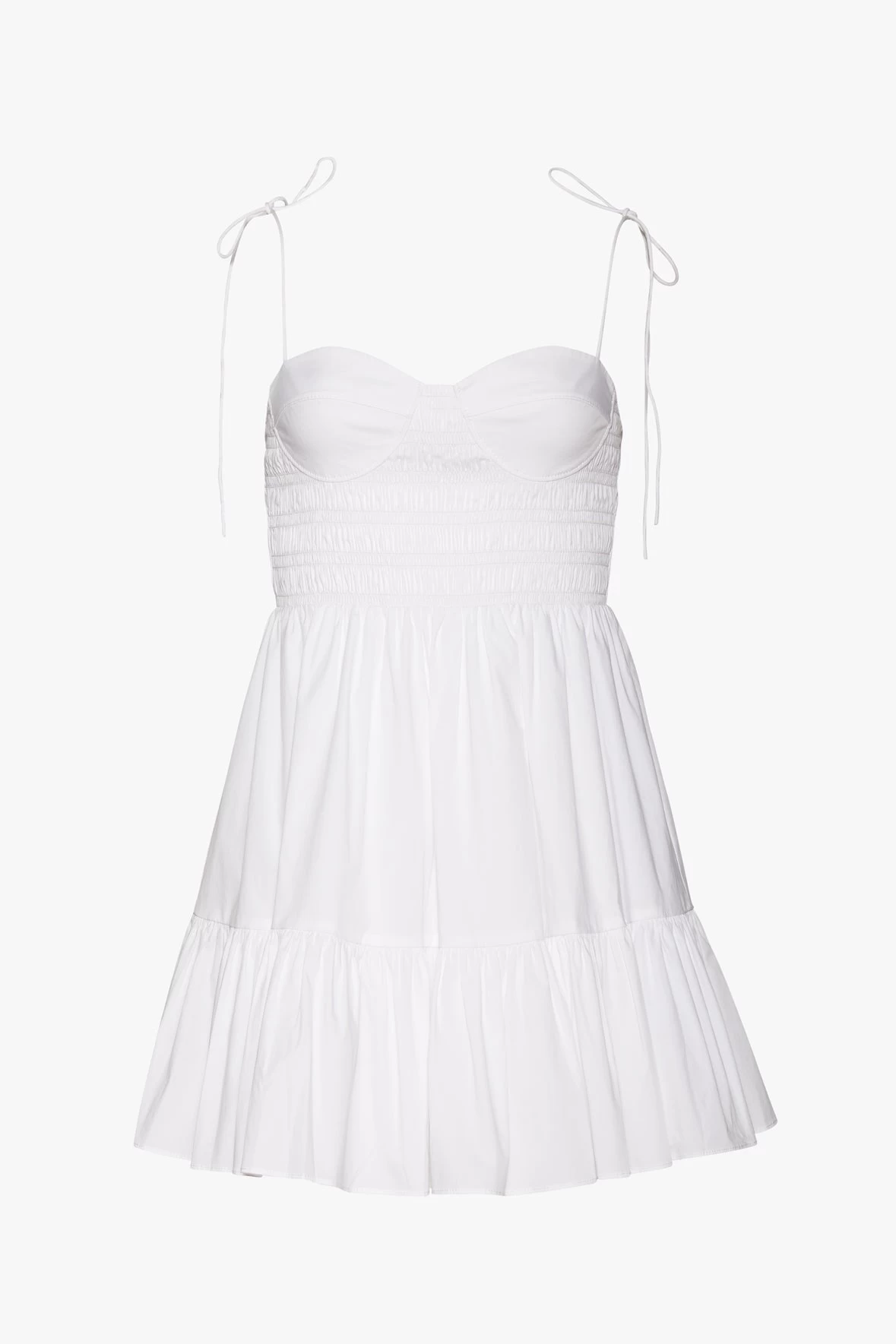 A tiered mini dress with smocked corset bodice, the Mini Landry features adjustable tie straps and a crinoline for added skirt volume.