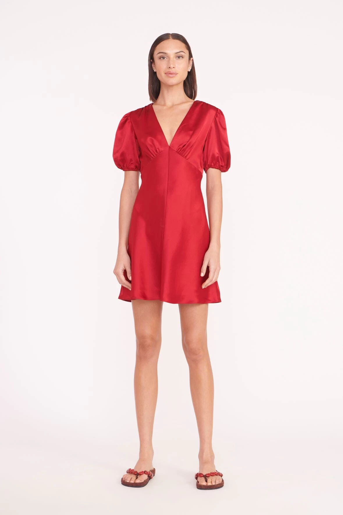 A short sleeve mini crafted from a drapey satin fabric, the Mini MIlla features a v neck and empire waistline. This seasonal update in satin has a hidden zipper closure at the side.
