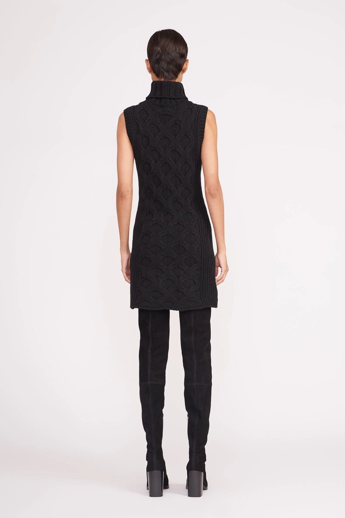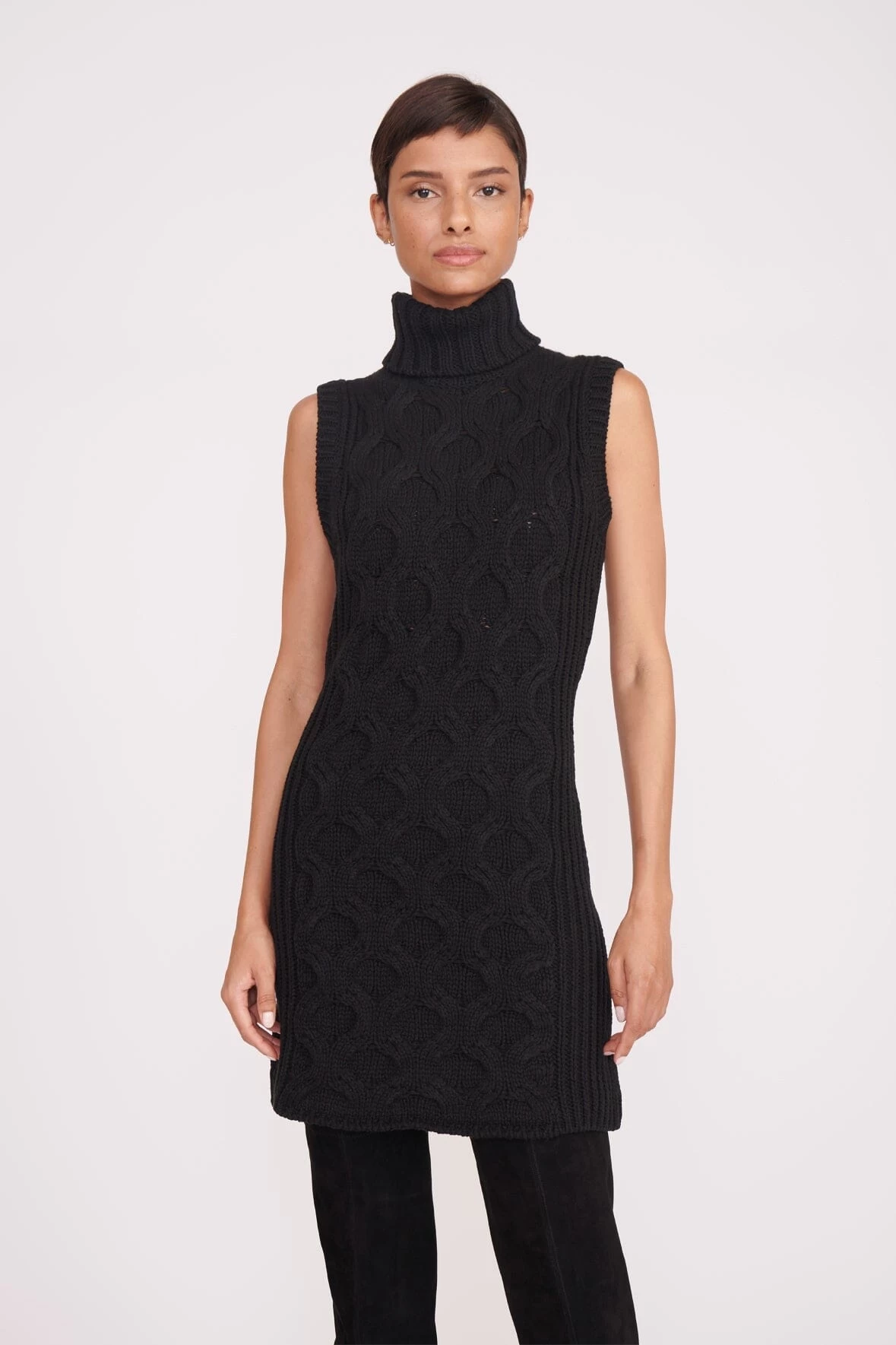 A mini sweater dress in a honeycomb cable knit, the Mod Dress is the perfect dress to layer under a coat with knee-high boots. The Mod Dress features a turtleneck and a sleeveless body.