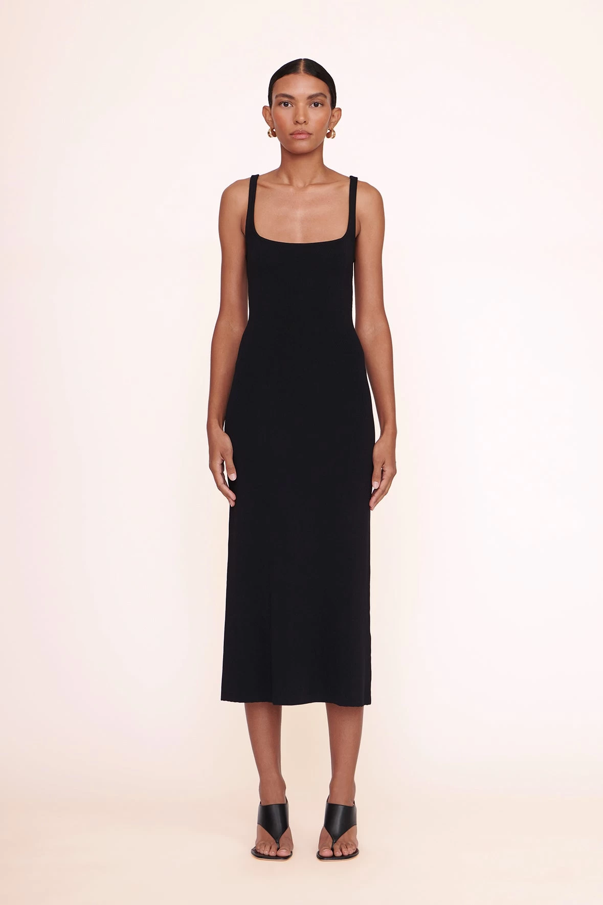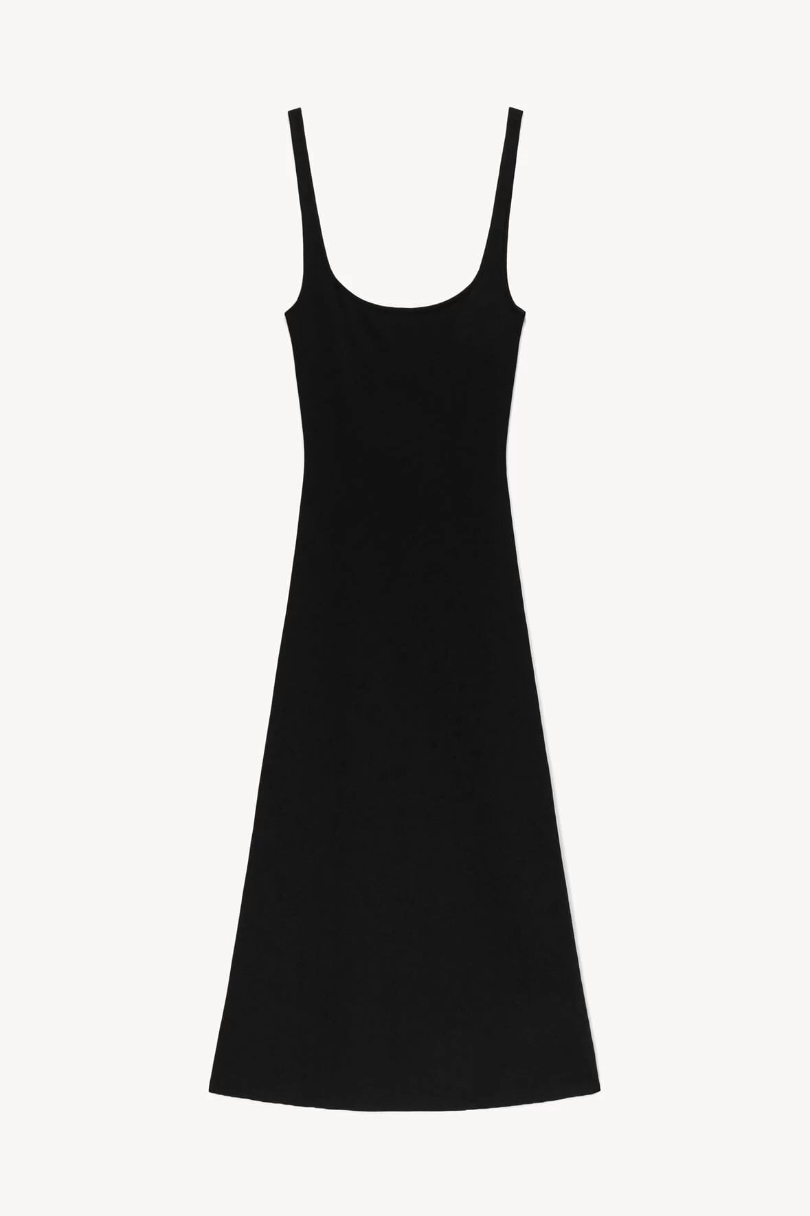 A fitted sleeveless dress made out of compact knit fabric. This style features a wide square neckline and midi length.