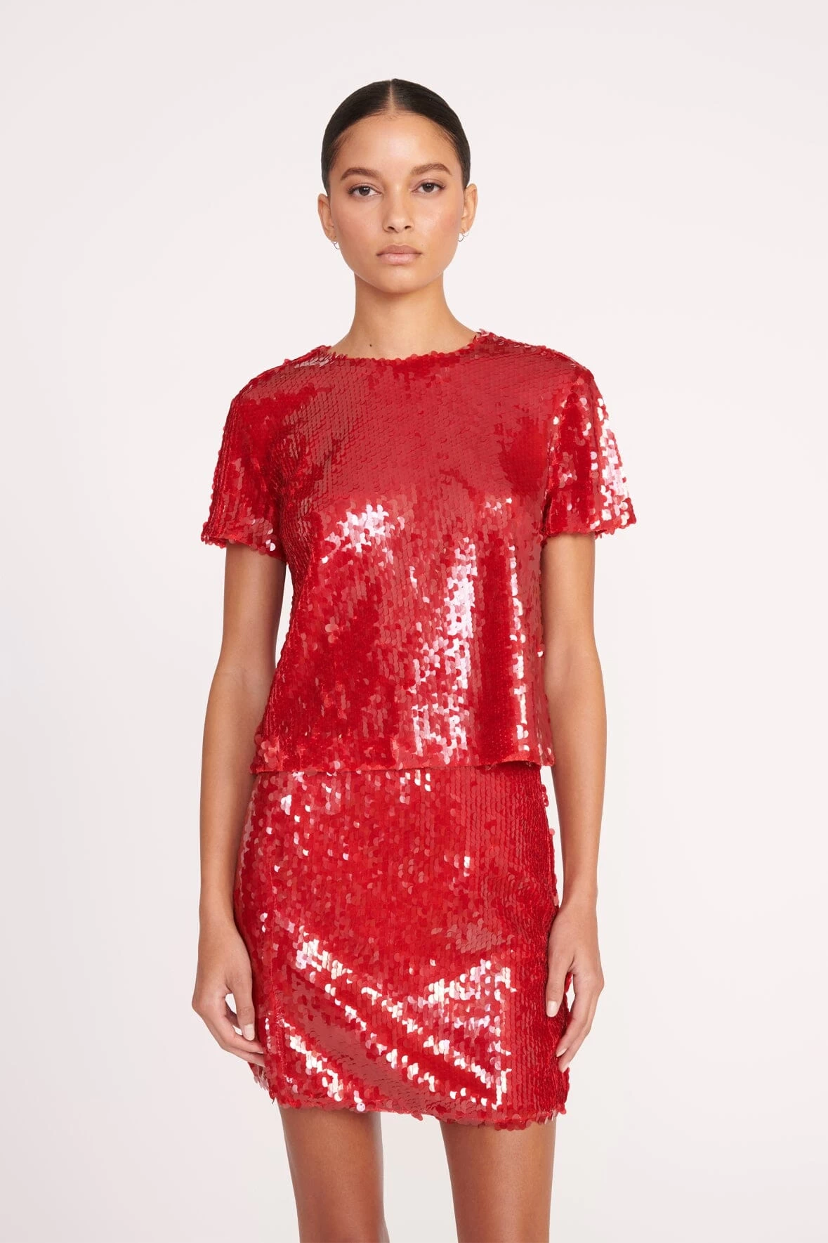 The Quincy Top is an easy-to-wear evening or cocktail separate featuring all over paillette embellishment. The Poinsettia Quincy Top can be paired with our Vedette Skirt for the perfect cocktail outfit.