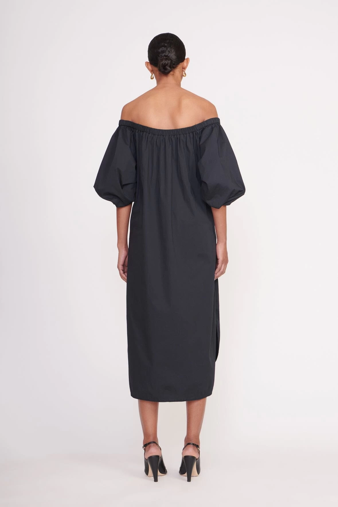 An off-the-shoulder cotton poplin midi dress. The Reese features a button down placket, gathered sleeves and a tie belt at the waist.