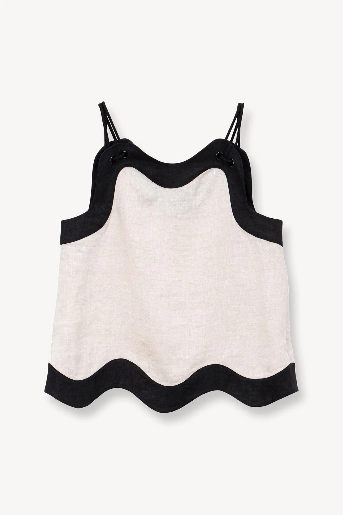 A sleeveless linen trapeze top, the Renata Top features contrast wiggle detail and natural rope straps.