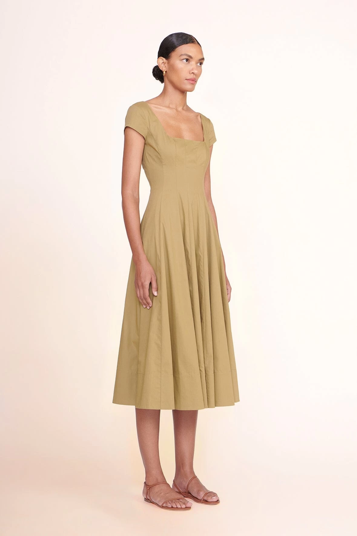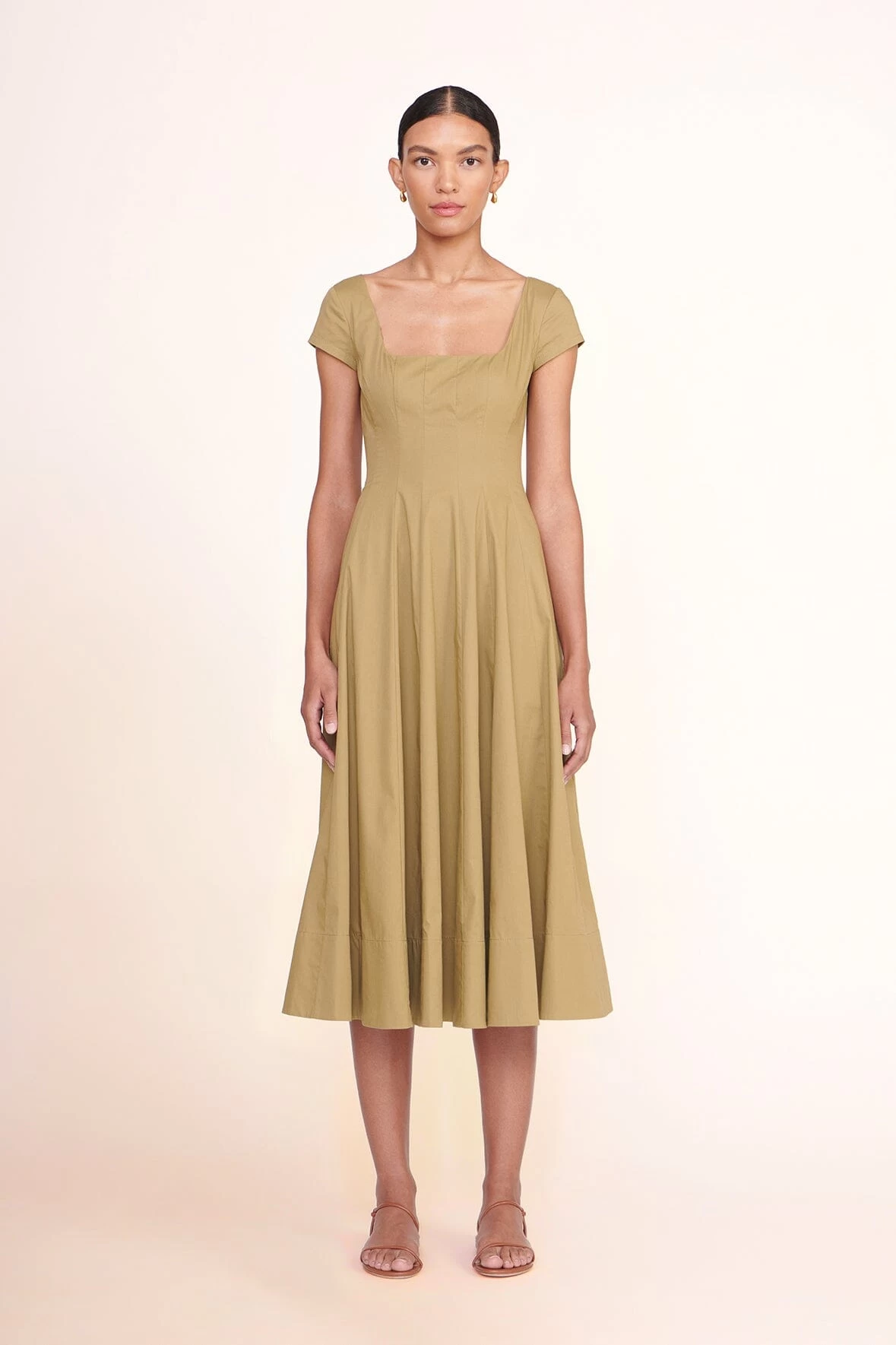 Our classic midi poplin dress in a short sleeve update. This style is fashioned after the STAUD signature Wells Dress and features the same corset-style panel construction and a-line skirt.