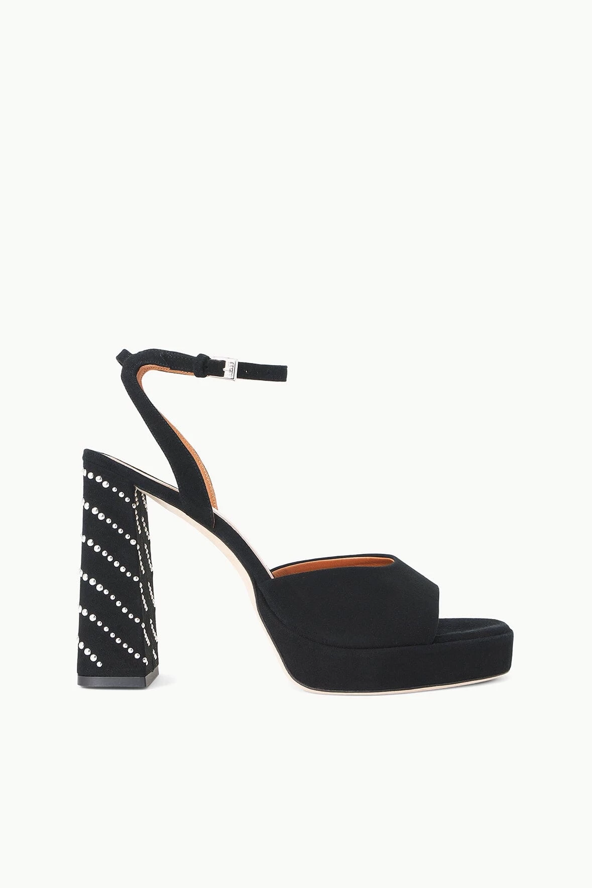 Updated for the season with a platform, the Solange is an open toe heel with ankle strap and buckle closure made out of suede with a metal stud embellished heel.