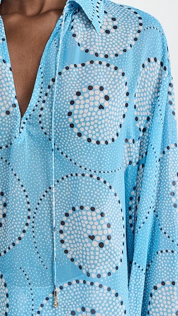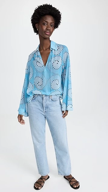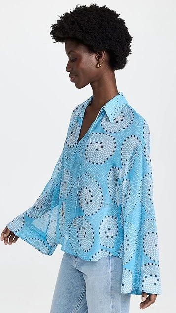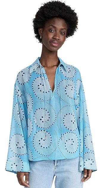 A unique spiral motif in a two-tone color scheme draws the eye to this STAUD blouse, which is crafted from silky, light-blue fabric. Jeans and trousers will both work equally well with this piece.