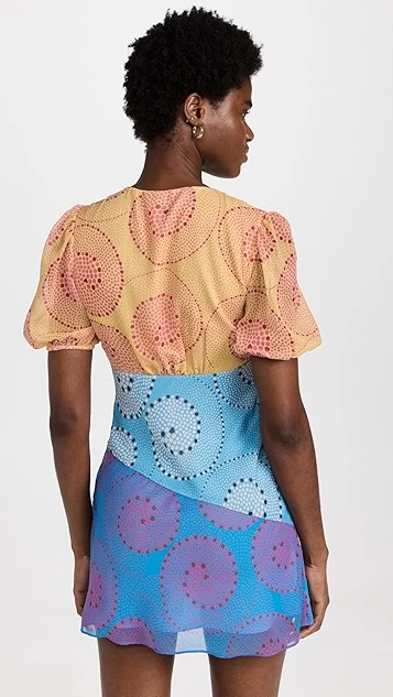 Sophisticated and truly distinct, this STAUD mini dress stands out with uniquely arranged colorblock panels and a spiraling abstract pattern. Go with simple footwear to keep the focus on this piece.