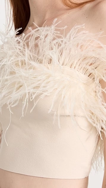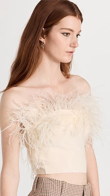 A classic tube top with a glamorous makeover, this eye-catching STAUD Nellie top combines a neutral shade with voluminous tufts of ostrich feathers. Wear yours with the tailored trousers of your choice, and accessorize with hoop earrings.