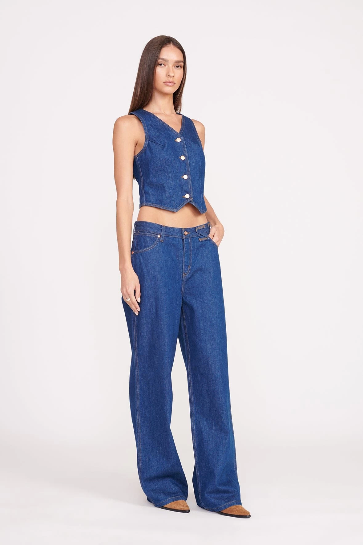The Loose Jean is our ultra-relaxed fit. This low-rise jean sits below the natural waist and a wide leg. This style is available in 2 inseam lengths and features our STAUD belt loop detail at the waist. Size down to wear as a mid-rise fit.
