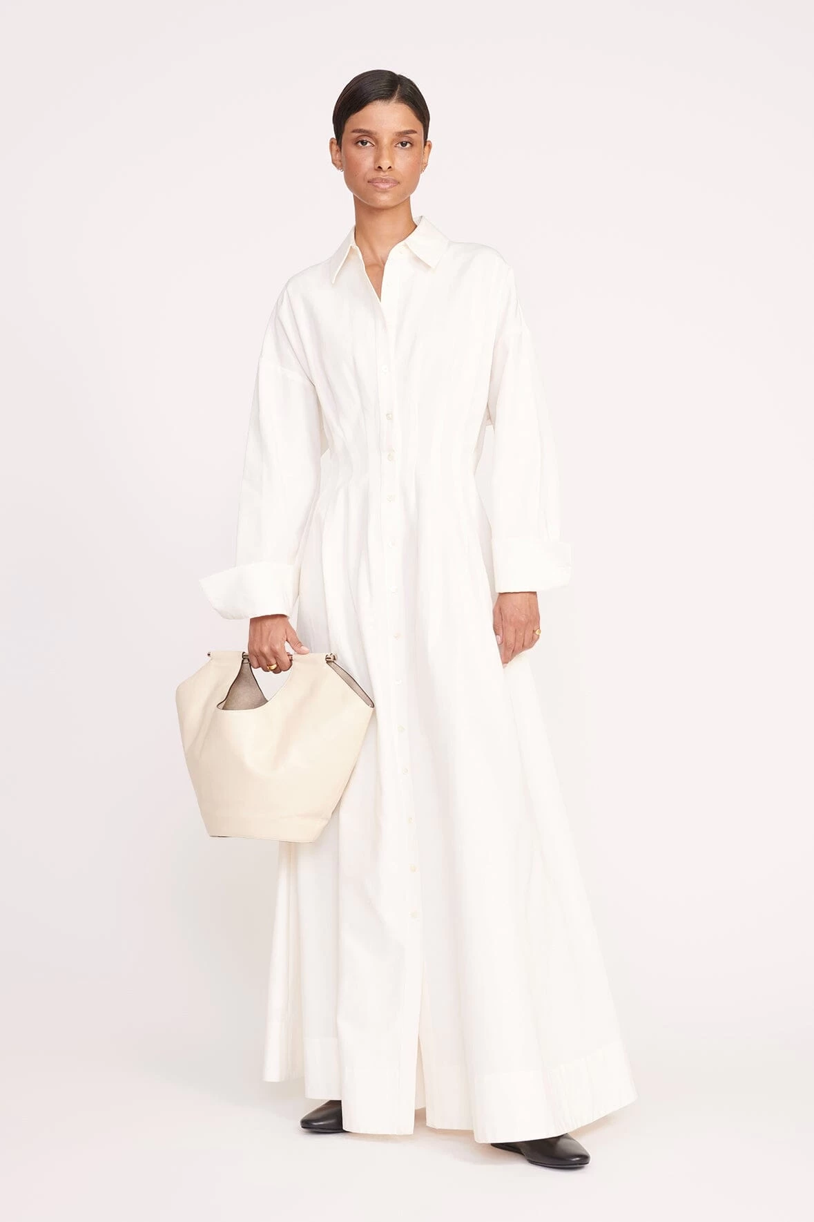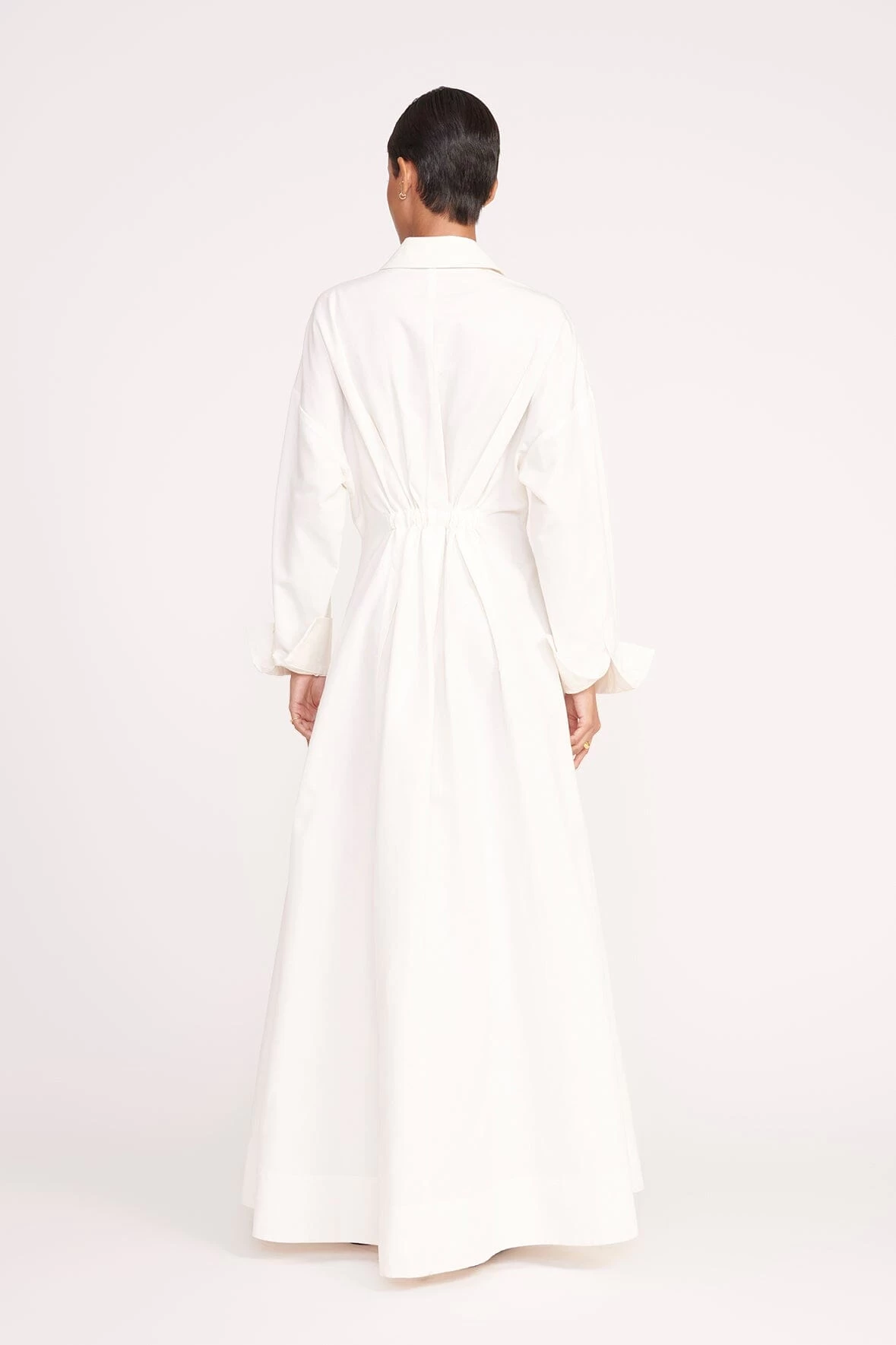 A chic button-up dress with a collar and oversized cuffs that can be worn buttoned or rolled up for an exaggerated look; The Winona Dress features a cinched waist with a comfortable elastic waistband at the back and is crafted in grosgrain.