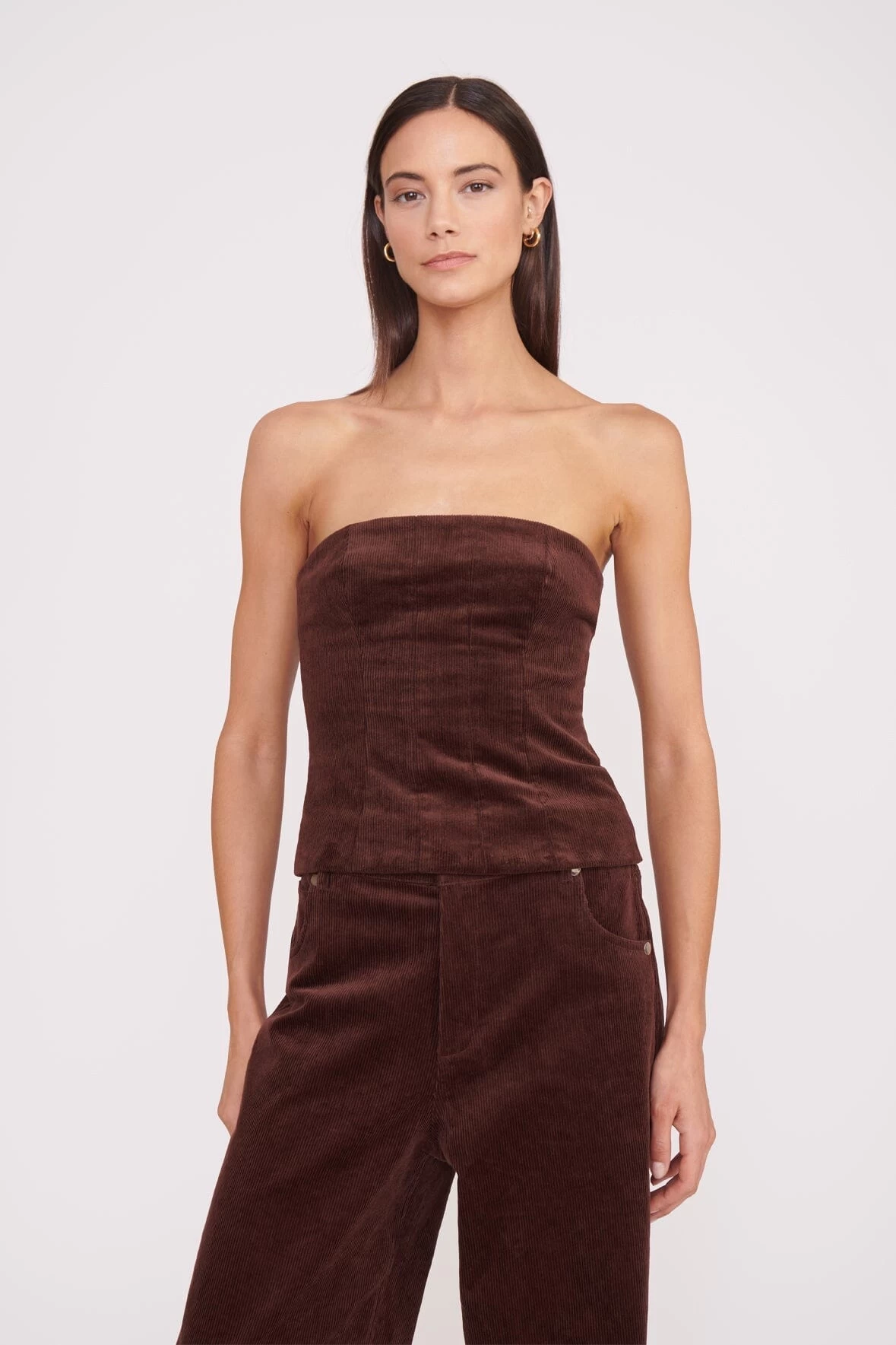 A fitted, strapless tube top with exposed back zipper. Updated in Corduroy, the Woodgrain Top the perfect Fall layering piece. Complete a coordinating set with the Grayson Pant.