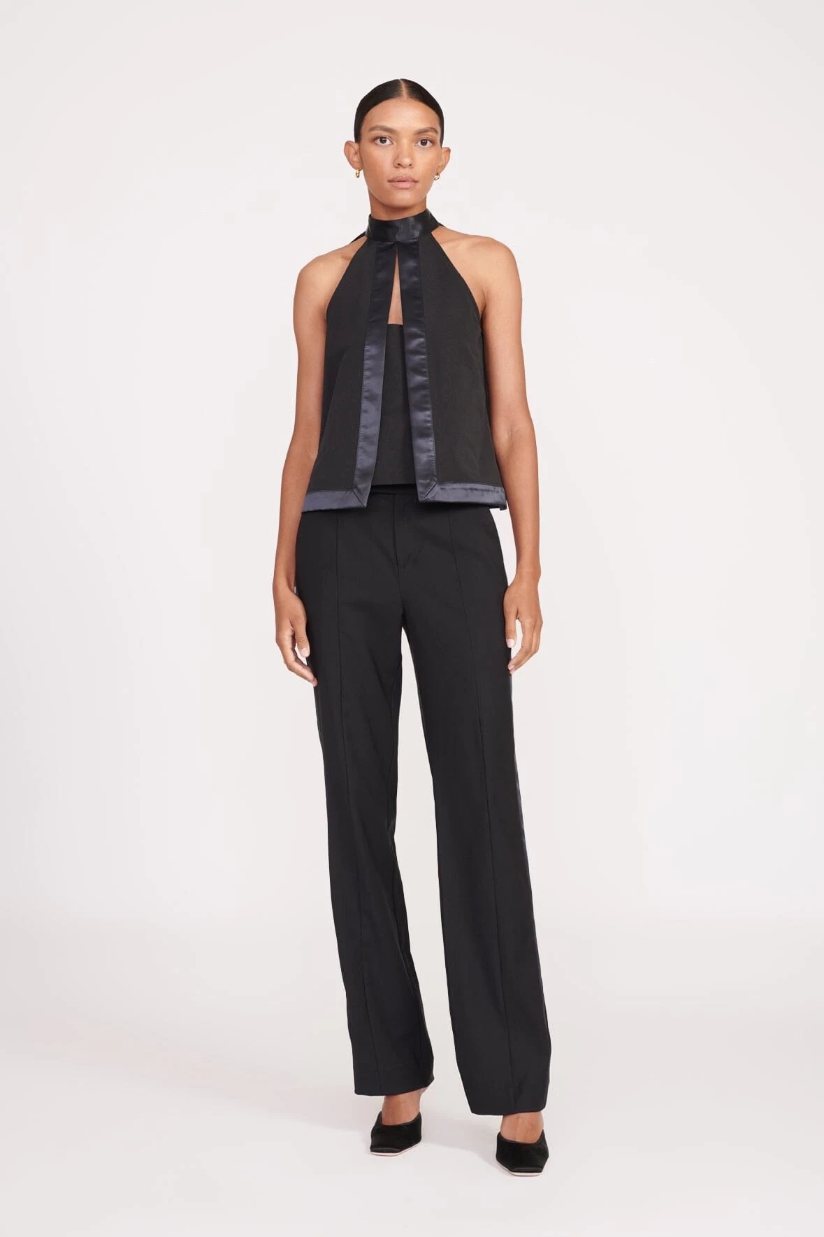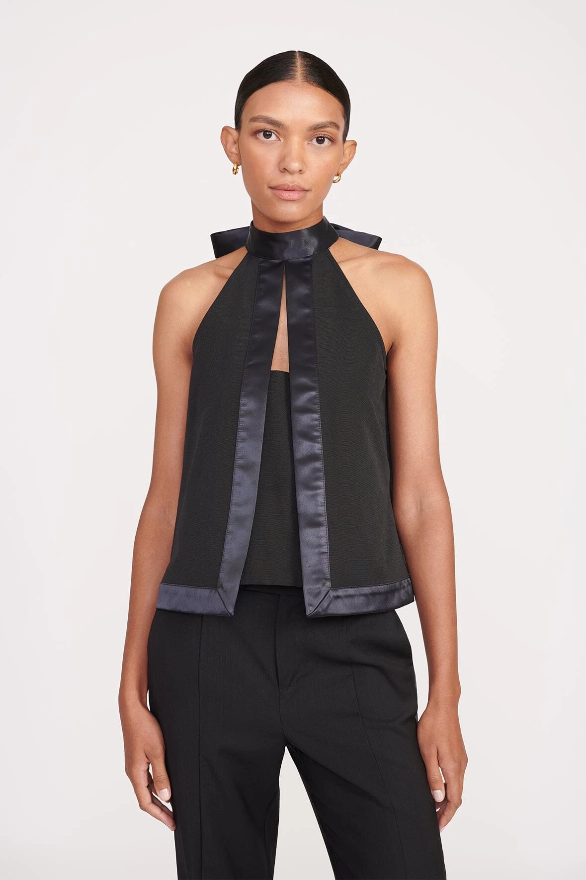 A hatlter top crafted from a structured grosgrain fabric. The Wright features a tie at the back and contrasting satin trim.